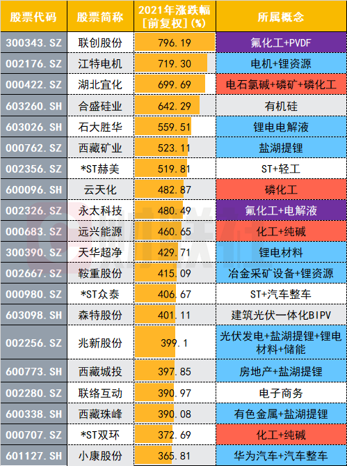 2021年A股涨幅王群像:化工+锂电,所向披靡