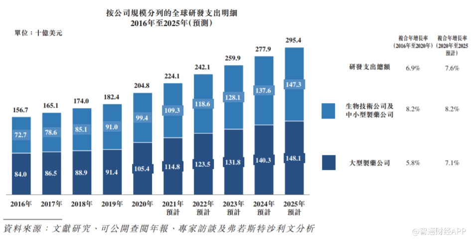 根据弗若斯特沙利文数据显示,预计生物技术及中小型制药行业的研发支出将于2020年至2025年按复合年增长率8.2%增长,快于同期大型制药行业的研发支出增速(预计复合年增长率为7.1%)。