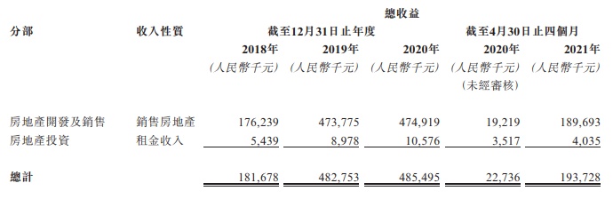 通过业绩可以看出,两项业务的收入均在2018至2020年保持连续的增长。其中可以明显的发现,房地产开发及销售占到了总收入较大的比例,截至今年前四个月占比达到97.92%。房地产投资收入虽占比较少,但即使因为疫情也没有过分的减少,可谓是稳定的收入来源。