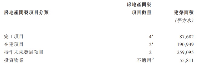 除此之外,该集团也对业务中的项目进行了分类。包括完工项目、在建项目、持作未来发展项目以及投资物业。其中的完工项目和投资物业,可以理解为已经带给集团收益的项目,分别拥有87682和55811平方米。另外两个项目是未来为集团带来收益的,在建项目以及持作未来发展项目,分别有19.10万和25.91万平方米。