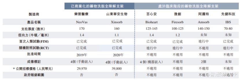 并且投资者不难看到,从市场竞争角度来看,目前中国全降解支架市场发展仍处于起步阶段,国内当前仅有两款已商业化的产品,均为第一代全降解支架产品,支柱厚度超过150微米。并且很多公司的第一代产品在一些常用规格(支柱厚度、径向力维度)产品中都有缺失。在此背景下,作为处于临床试验阶段的第二代在研产品,百心安Bioheart的先发优势较为明显。