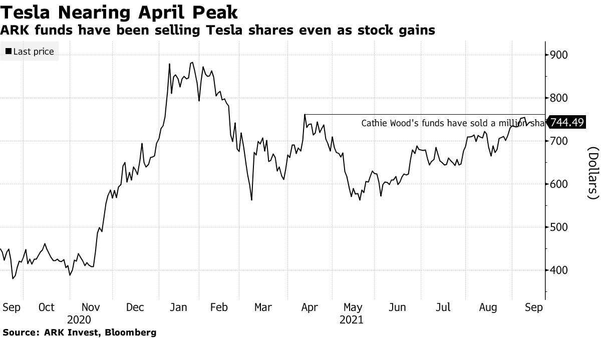 Ark的战略通常是出售一些涨幅较大的股票,以便投资其他目标。近几个月来,其基金持有的特斯拉价值飙升,该公司股价较今年3月创下的2021年低点上涨了32%。