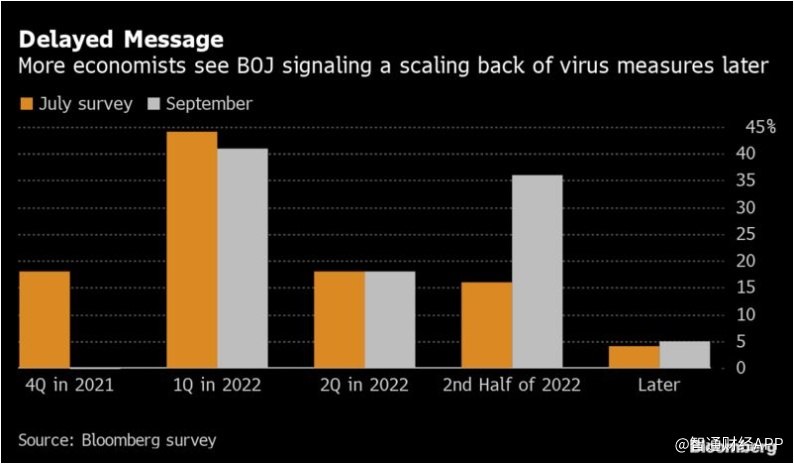 没有经济学家认为日本央行会在今年最后三个月缩减与疫情相关的措施,这一比例低于两个月前调查中的18%。