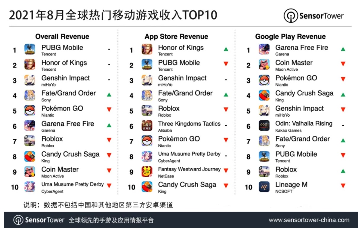 智通财经APP获悉,Sensor Tower发布数据显示,2021年8月腾讯(00700)《和平精英》和《PUBG Mobile》在全球 App Store 和 Google Play吸金2.7亿美元,相较2020年8月增长4.7%,蝉联全球手游畅销榜冠军。其中,61.4%的收入来自《和平精英》iOS版本,《PUBG Mobile》在美国和土耳其市场的收入分别占9%和6.5%;腾讯《王者荣耀》以2.56亿美元的收入位列榜单第2名,相较去年8月增长3%。来自中国App Store的收入占95%,海外版本收入占比为5%。