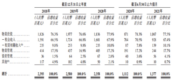 而分项目来看,瑞安新天地的收入来源于物业投资、物业管理和资产管理三大板块。其中,物业投资是公司的主要收入来源,2018年-2020年该业务分别实现收入18.26亿元、19.77亿元、18.36亿元,占比为76.3%、76.6%、77.9%,占到公司总收入的近八成。进一步划分,该业务又可以划分为租金收入和租赁相关收入两个部分,前述期内公司租金收入分别实现收入15.91亿元、17.24亿元、16.01亿元,占公司总收入比重的66.5%、66.8%、67.9%。