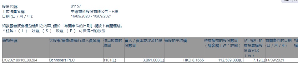 智通财经APP获悉,香港联交所最新资料显示,9月14日,Schroders PLC增持中联重科(01157)306.1万股,每股作价8.1665港元,总金额约为2499.77万港元。增持后最新持股数目约为1.13亿股,最新持股比例为7.12%。