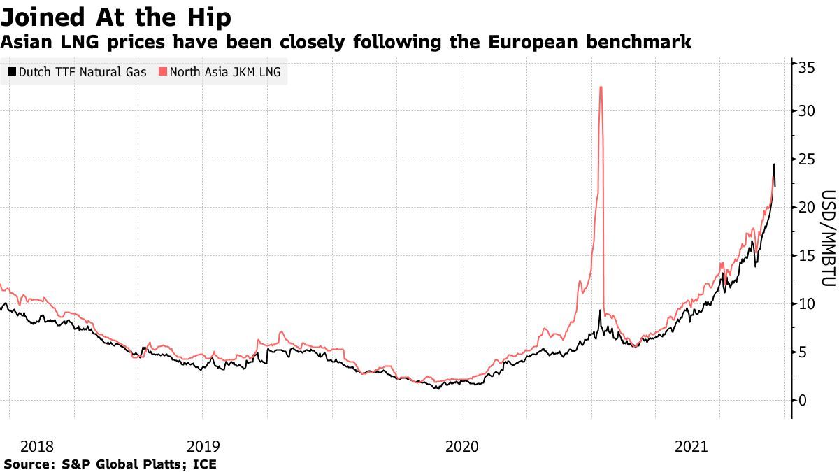 这一点在液化天然气市场表现得最为明显,据知情交易员透露,周三,日本东北电力公司和印度天然气公司(GAIL India)已购买了11月和12月的液化天然气,而价格创下了每年这个时候的最高水平。