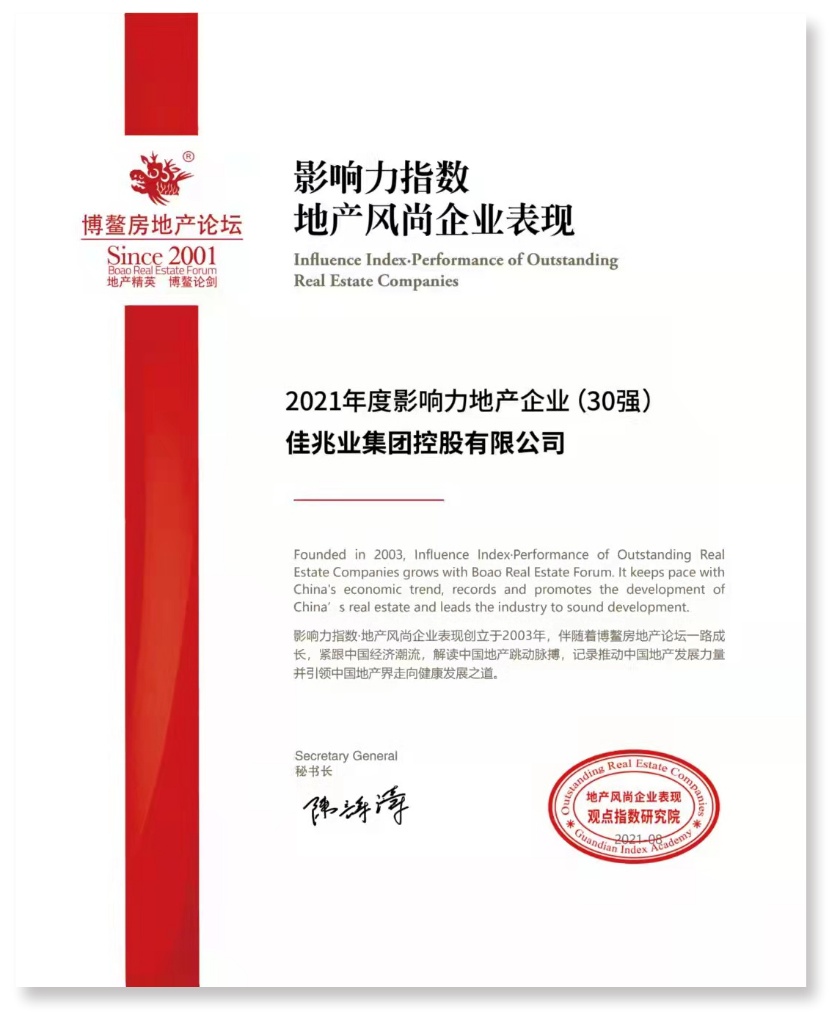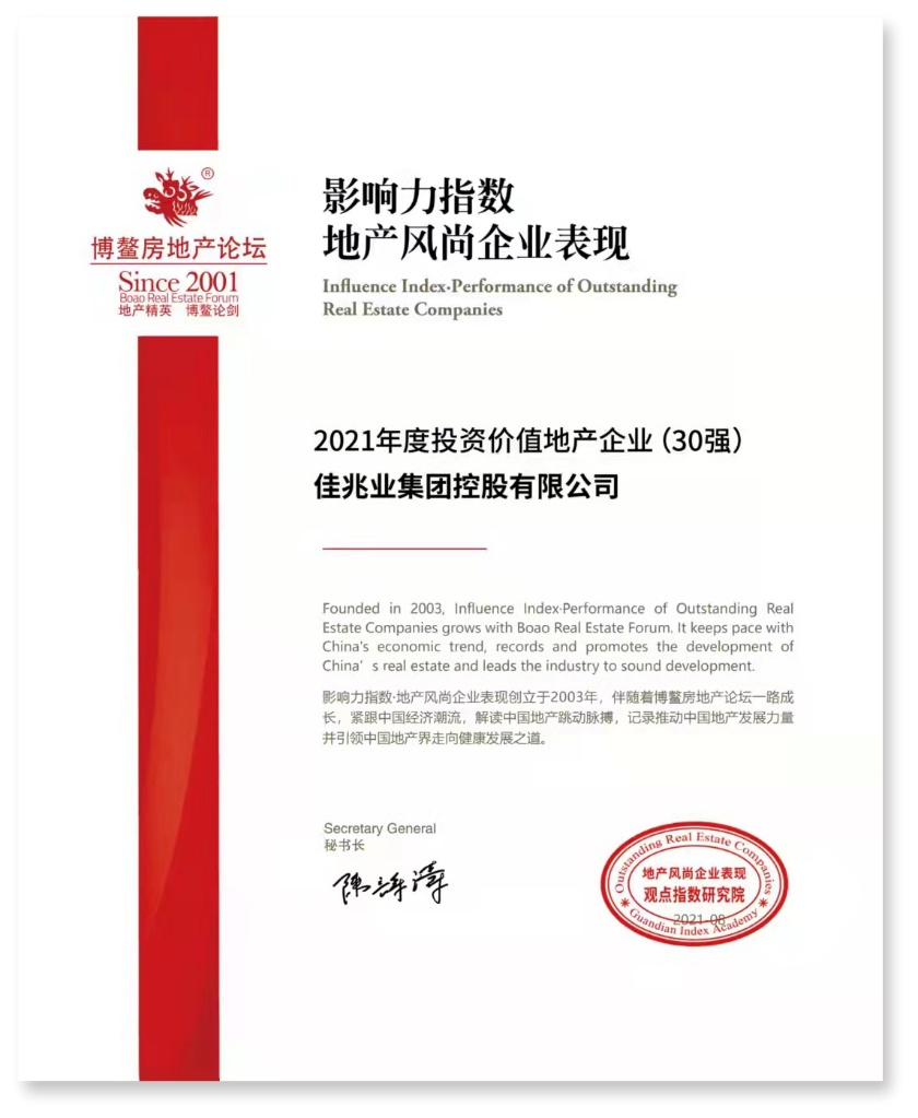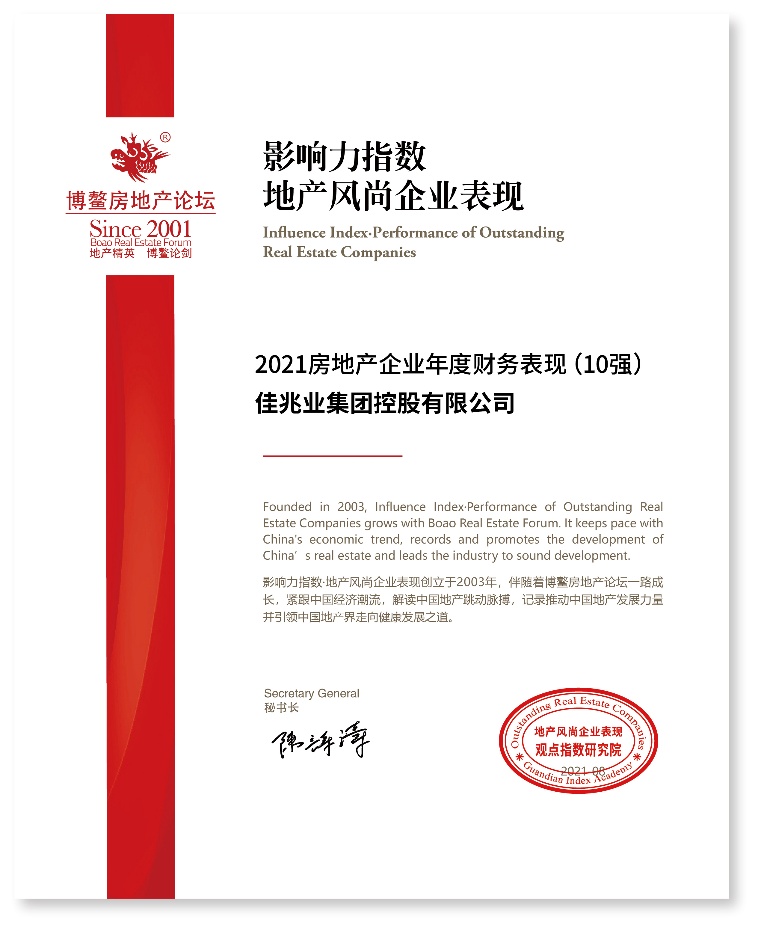 9月15日至18日,以“理性与稳健,房地产的改变”为主题的观点·2021博鳌房地产论坛在海南举行。论坛举办同期,观点指数研究院重磅发布“2021年度地产风尚企业表现”,佳兆业集团(01638)凭借稳健的财务策略及强劲的综合实力获评“2021房地产企业年度财务表现10强”、“2021年度投资价值地产企业30强”、“2021年度影响力地产企业30强”三项殊荣。