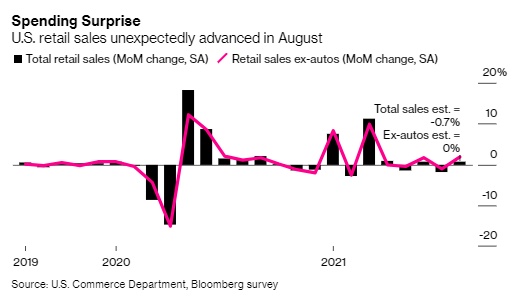 美国8月零售销售数据超预期改善,部分得益于返校购物和数以百万计有子女家庭获得的资金补助,也表明商品需求的坚韧。该报告显示无店铺零售商、杂货店和家具店收入更强。此外,Delta变异毒株正在抑制对旅游和休闲等服务业的需求。数据显示,8月份餐饮和酒吧的收入停滞不前,相比之下杂货店收入则增长了2.1%。