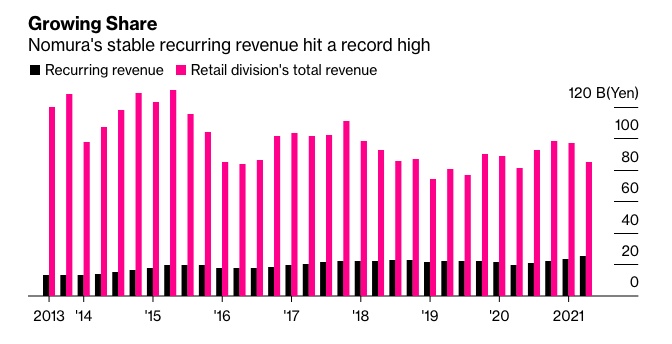 这家日本最大的券商一直在逐步实现业务多元化,从为散户客户交易股票,转向为富裕客户管理资金。零售业务主管Satoshi Arai表示,这有助于产生更稳定的管理费用收入,上个季度投资和其他服务的常续性收入攀升至创纪录水平,并可能继续增长。