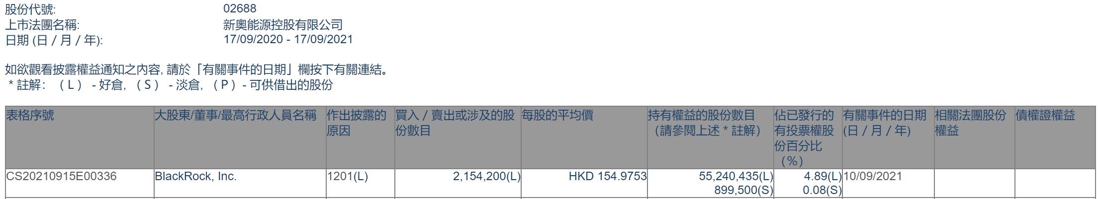 智通财经APP获悉,香港联交所最新资料显示,9月10日,贝莱德减持新奥能源(02688)215.42万股,每股作价154.9753港元,总金额约为3.34亿港元。减持后最新持股数目约为5524.04万股,最新持股比例为4.89%。