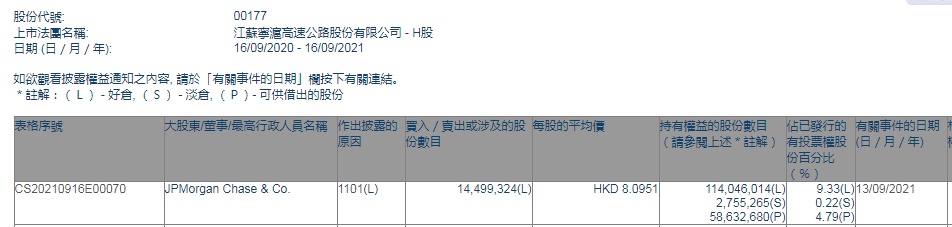 智通财经APP获悉,香港联交所最新资料显示,9月13日,小摩增持江苏宁沪高速公路(00177)1449.9324万股,每股作价8.0951港元,总金额约为1.17亿港元。增持后最新持股数目约为1.14亿股,最新持股比例为9.33%。