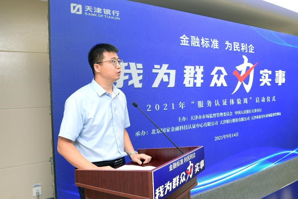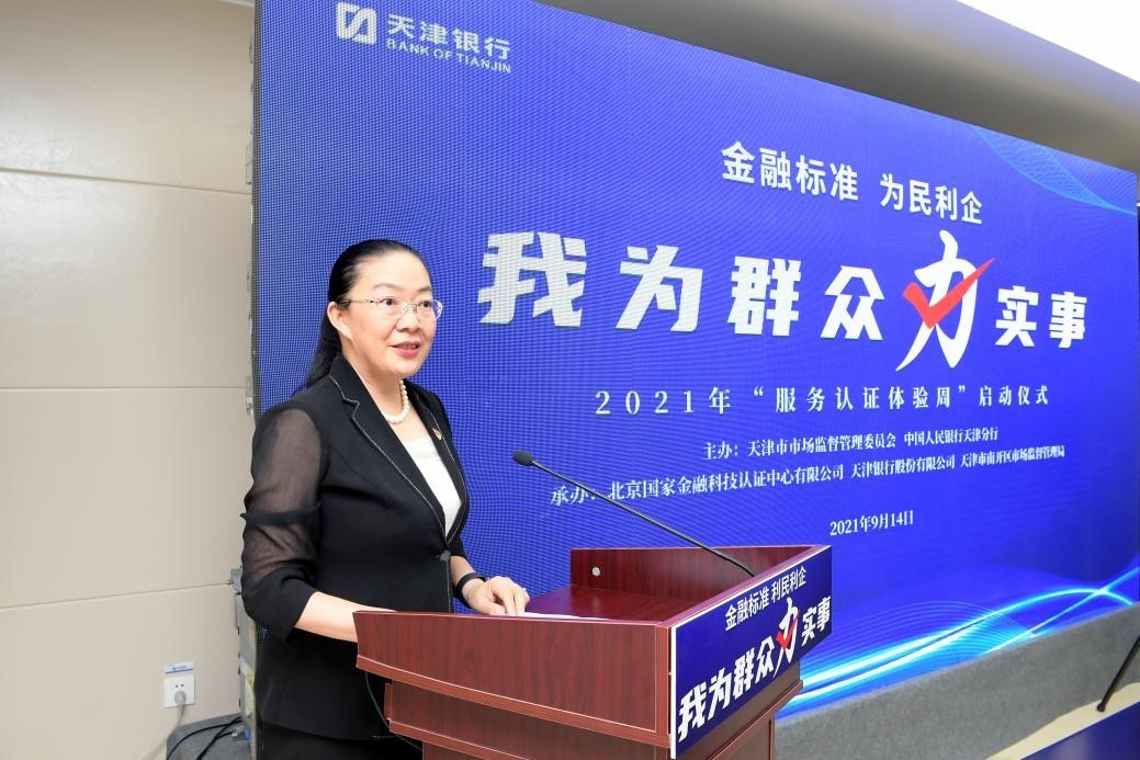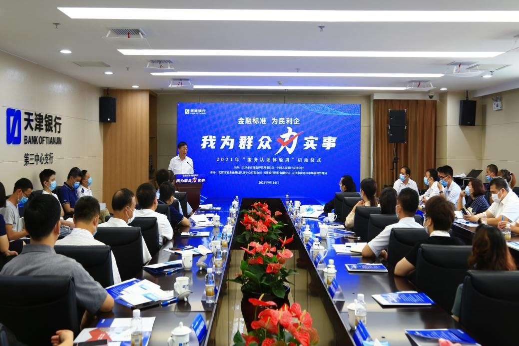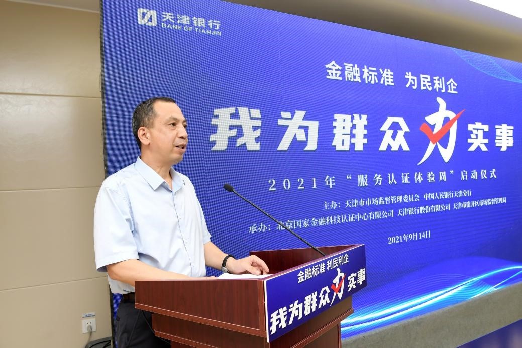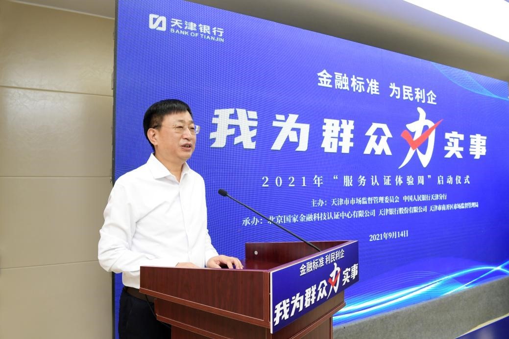 2021年9月14日上午,由天津市市场监管委、人民银行天津分行主办,天津银行、北京国家金融科技认证中心承办的“我为群众办实事,认证在行动”—2021年“服务认证体验周”启动仪式暨天津首家“适老服务示范网点”授牌仪式在天津银行第三中心支行举办。天津市市场监管委副主任赵金恒,中国人民银行天津分行副行长曹元芳,天津银行党委副书记、行长吴洪涛以及北京国家金融科技认证中心副总经理李振出席并致辞。天津市各区市场监管局、同业金融机构及天津银行有关代表出席活动。