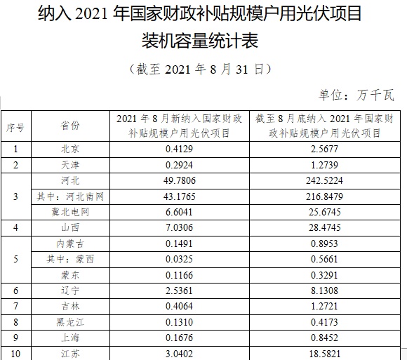智通财经APP获悉,根据各省级能源主管部门、电网企业报送信息,经国家可再生能源信息管理中心梳理统计,2021年8月新纳入国家财政补贴规模户用光伏项目总装机容量为184.59万千瓦。截至2021年8月底,全国累计纳入2021年国家财政补贴规模户用光伏项目装机容量为952.35万千瓦。详细情况见附表。