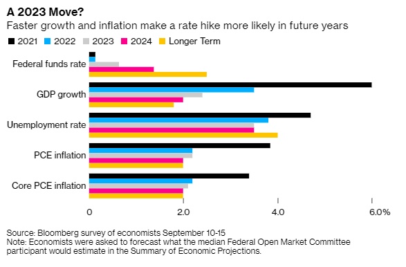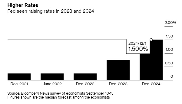 FOMC成员将在本次会议上提交他们的季度预测,包括备受关注的利率预测“点阵图”。经济学家们预计,利率预测不会偏离6月份公布的预测,预计加息将在2023年进行。这一预测将首次包括2024年,届时利率预计将再次上升。