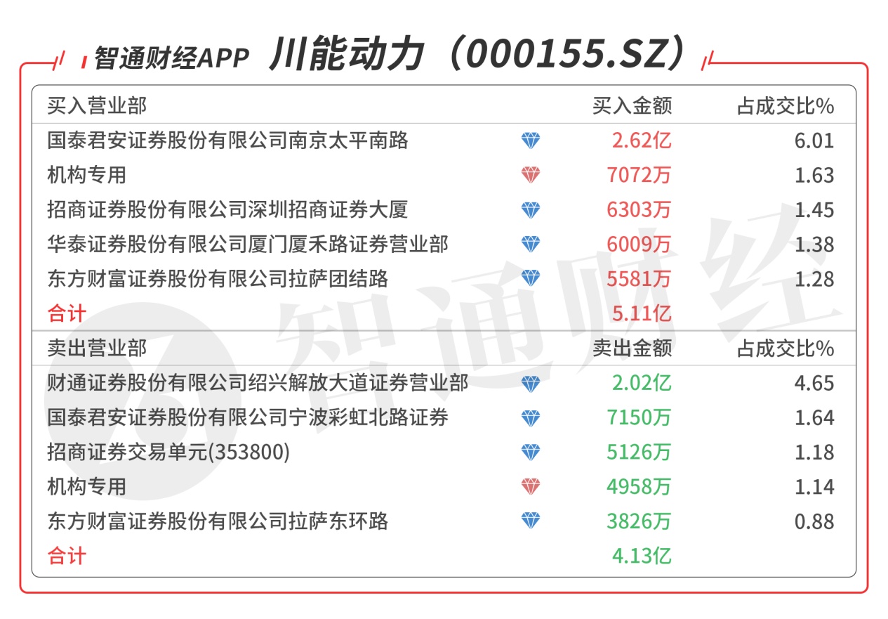 川能动力(000155.SZ):多主力现身龙虎榜,买一是知名游资作手新一的席位买入2.62亿元,买四是知名游资山东帮的席位买入6009万元,机构对倒净买入3753万元,当日净买入1.82亿元,今日上板坚决,封单很稳,有望突破前期高点。