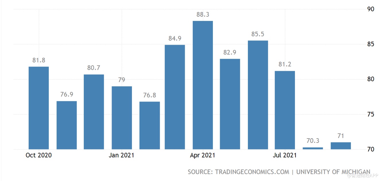 潘森宏观经济分析师指出,美国消费者信心在9月仅较8月略有上升,但一旦明确,由于德尔塔毒株的传播而导致的新冠病例增加正在减缓,消费者信心指数应该会很快开始反弹。美国密歇根大学消费者信心指数调查显示,虽然德尔塔毒株对人们造成打击,但消费者信心正在企稳。与春季和疫情前水平相比,市场情绪仍然低迷,但我们认为9月份的数据将是最低水平。