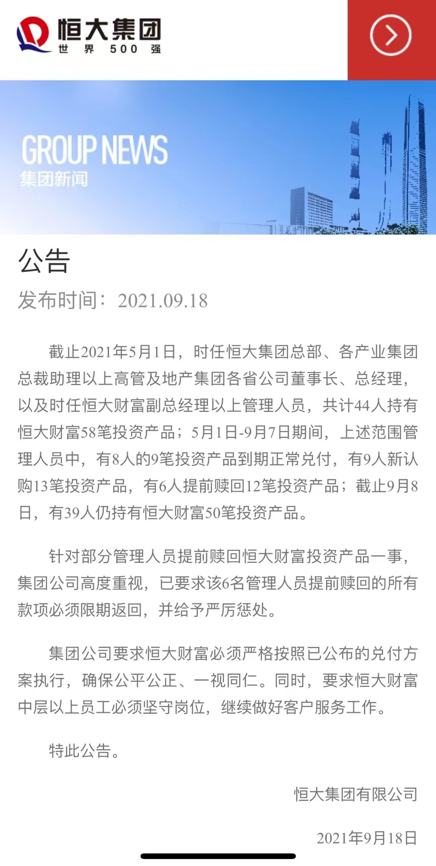 智通财经APP获悉,9月18日凌晨,恒大的一则公告,让我们感受到许老板的“铁面无私”。公告显示,针对部分管理人员提前赎回恒大财富投资产品一事,集团公司高度重视,已要求该6名管理人员提前赎回的所有款项必须限期返回,并给予严厉惩处。