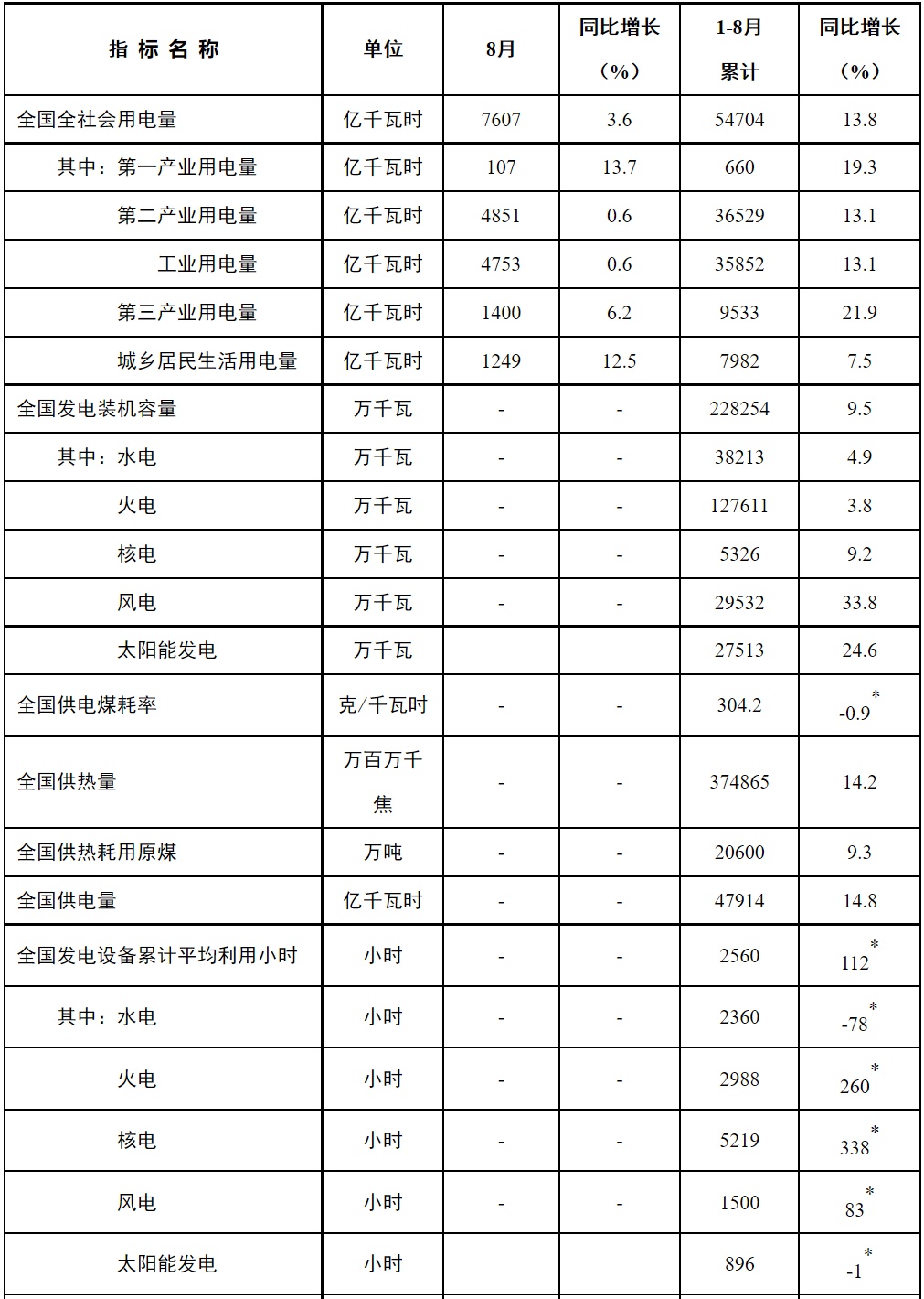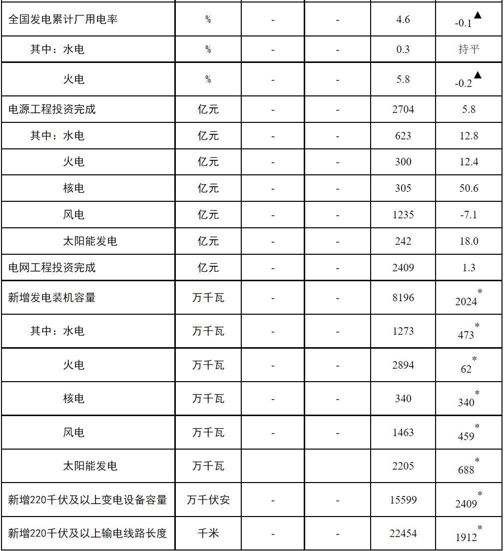 注:1.全社会用电量为全口径数据,全国供电量为调度口径数据。2.“同比增长”列中,标*的指标为绝对量;标▲的指标为百分点。