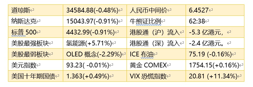 1、 上周五美股截至收盘,道指跌166.44点或0.48%,报34584.88点;纳指跌137.96点或0.91%,报15043.97点;标普500指数跌40.76点或0.91%,报4432.99点,为8月18日以来最大收盘跌幅。 道指上周累跌0.07%,标普500指数累跌0.58%,纳指累跌0.47%,均连续两周录得下跌。标普500指数、纳指均录得连续第二周下跌。港股ADR指数跟随下挫,按比例计算,收报24555点,跌112.05点或0.46%。