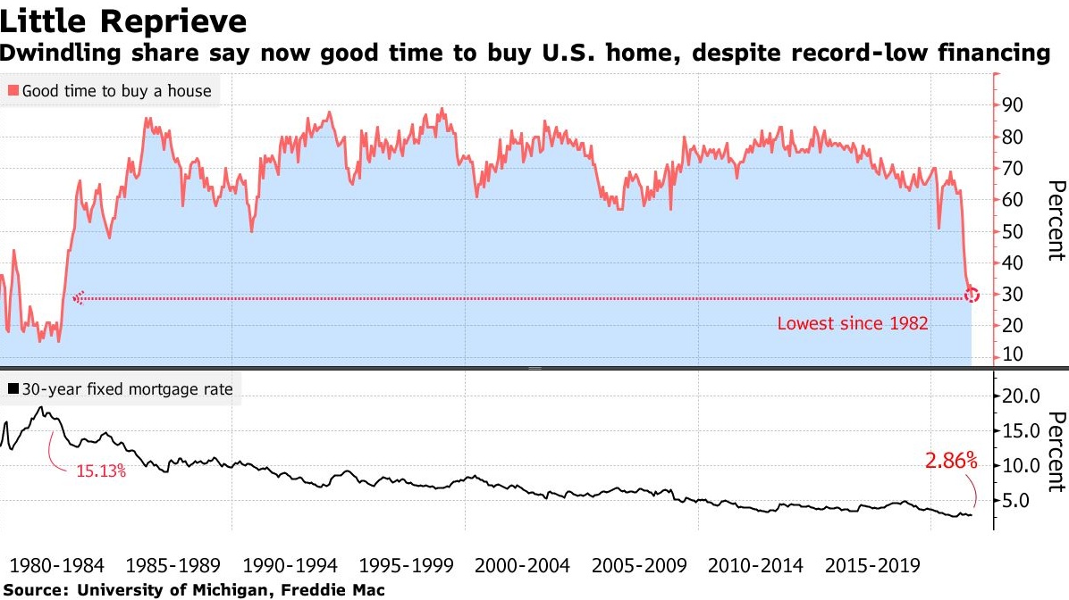 当时,美国30年期固定利率抵押贷款的平均利率高达15%。相比之下,近期的30年期利率为2.86%。