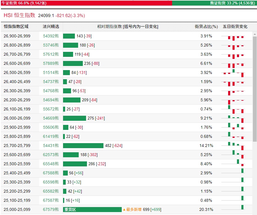 法兴恒指牛熊证街货分布图中的数据显示,熊证街货重货区在25,000-25,099区间,该区间最新熊证数量为699张,较上一交易日增加699张;最多新增与重货区位于同一区间。
