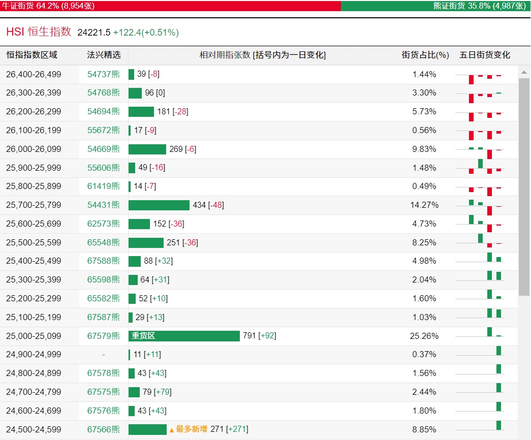 法兴恒指牛熊证街货分布图中的数据显示,熊证街货重货区在25,000-25,099区间,该区间最新熊证数量为791张,较上一交易日增加92张;最多新增在24,500-24,599区间,该区间最新熊证数量为271张,较上一交易日增加271张。