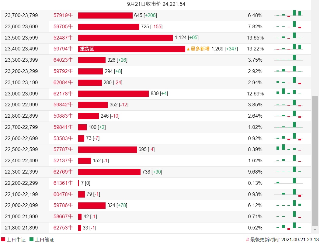 牛证街货重货区在23,400-23,499区间,该区间最新牛证数量为1,269张,较上一交易日增加347张;最多新增与重货区位于同一区间。