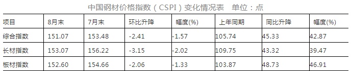 据中国钢铁工业协会(以下简称钢协)监测,8月末,中国钢材价格指数(CSPI)升至151.07点,比7月末下降2.41点,降幅为1.57%;与上年同期相比上升45.33点,升幅为42.87%。(见下图)