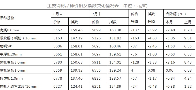 8月末,在钢协监测的八大钢材品种中,除冷轧薄板价格相对平稳外,其它品种均有所下降。其中,高线、螺纹钢、热轧卷板降幅较大,环比分别下降137元/吨、163元/吨和128元/吨;角钢、中厚板、镀锌板和热轧无缝管降幅相对较小,环比分别下降87元/吨、36元/吨、57元/吨和24元/吨。(见下表)