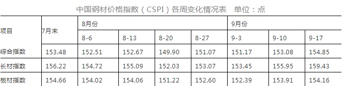 8月份,CSPI钢材价格指数呈波动下行走势;进入9月份以来,钢材价格由降转升,前三周指数呈小幅上升走势。(见下表)
