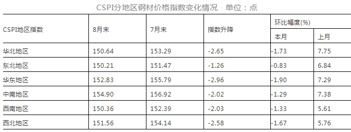 8月份,CSPI全国六大区域指数均由升转降。其中:华北、东北、华东、中南、西南和西北地区环比降幅分别为1.73%、0.83%、1.90%、1.29%、1.33%和1.67%。(见下表)