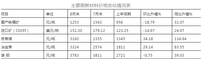 据钢协监测,8月末,国产铁精矿价格环比下降290元/吨,CIOPI进口矿价格环比下降26.82美元/吨,炼焦煤和冶金焦价格环比分别上升805元/吨和750元/吨,废钢价格环比下降28元/吨。从同比情况看,原燃材料价格仍处高位,其中国产铁精矿和进口矿分别同比上涨31.07%和24.97%,炼焦煤和冶金焦价格分别同比上涨134.94%和83.55%,废钢价格同比上涨39.03%。虽然铁矿石价格明显下降,但煤焦价格大幅上涨,致使钢材成本仍处于较高水平。(见下表)