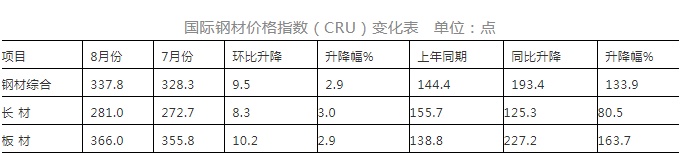8月份,国际钢材价格指数(CRU)为337.8点,环比上升9.5点,升幅为2.9%;与上年同期相比上升193.4点,升幅为133.9%。(见下图、表)