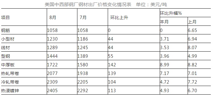 8月份,CRU北美钢材价格指数为430.5点,环比上升21.2点,升幅为5.2%,较上月收窄1.7个百分点;美国制造业PMI为59.9%,环比上升0.4个百分点。其中生产指数上升1.6个百分点,库存指数上升5.3个百分点;8月末,美国粗钢产能利用率为84.9%,环比下降0.1个百分点。本月美国中西部钢厂的钢筋价格保持平稳,其他品种钢材价格继续上升。(见下表)
