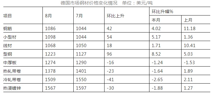 8月份,CRU欧洲钢材价格指数为365.1点,环比上升2.3点,升幅为0.6%,较上月缩小5.5个百分点;欧元区制造业PMI为61.4%,环比下降1.4个百分点。其中德国、意大利、法国和西班牙制造业PMI分别为62.6%、60.9%、57.5%和59.5%,环比上月稳中略降。本月德国市场板材品种价格有所下降,长材价格继续上升。(见下表)