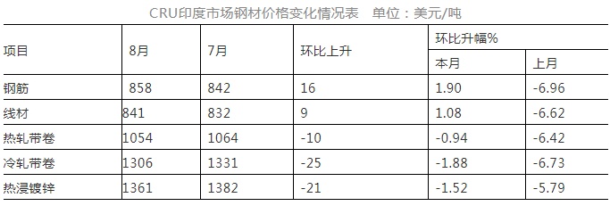 8月份,CRU亚洲钢材价格指数为268.2点,环比上升6.7点,升幅为2.6%,环比由降转升;日本制造业PMI为52.7%,环比下降0.3个百分点;韩国制造业PMI为51.2%,环比下降1.8个百分点;中国制造业PMI为50.1%,环比下降0.3个百分点。本月印度市场除钢筋和线材价格由降转升外,其余品种价格均持续下降,环比降幅收窄。(见下表)