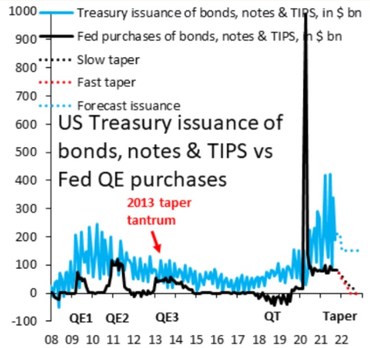 根据国际金融研究所首席经济学家Robin Brooks提供的图表,其中包括“快速taper”和“缓慢taper”的情形。Brooks指出,FOMC认为,缩债应该在2022年年中完成。这意味着“快速”缩减购债规模(红色点图),即每月减少100亿美元的美国国债购买量,这将使得美联储在6月份之前完成结束购债。这还意味着,11月的FOMC会议将宣布taper,以及11月的购债规模将从10月的800亿美元降至700亿美元。