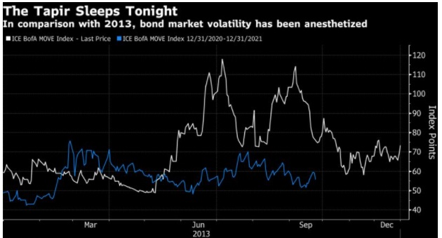 如果观察衡量美国国债预期价格波动的ICE BofA MOVE指数,可以观测到与2013年相比,当前交易员对美联储今年的缩减购债非常平静。2013年12月缩减购债规模之前,美联储在等待这一指数的下降。而这次的情况应该可以让美联储在11月开始taper。