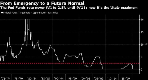 然而,美联储强硬的程度有限制。如果回顾历史,我们会发现联邦基金利率在911事件后首次跌至2.5%。虽然利率下调是应对灾难的紧急措施,但FOMC现在似乎认为,从现在开始,2.5%将是利率水平的上限(图中红色虚线)。