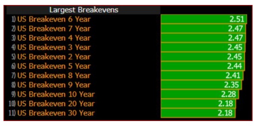 这表明对经济增长信心不足,以及对当前通胀只是暂时现象的观点信心十足。点阵图还表明,美联储对通胀只是暂时现象的信心甚至明显高于市场。 下图显示了FOMC会议后美国盈亏平衡通胀率: