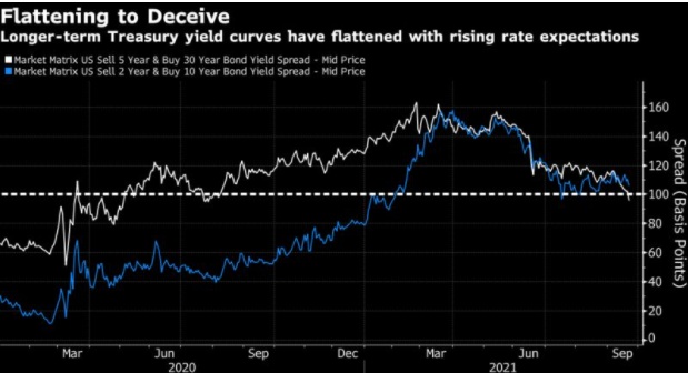 就美国国债市场而言,美债收益率曲线正在趋平。 FOMC会议后,5年期和30年期美国国债收益率差跌至100基点以下,为去年杰克逊霍尔会议前夕以来首次。 如此平坦的曲线意味着未来不会有太高的通胀,但也不会有太多的增长。这表明债券市场认为美联储将实行鹰派作风,扼杀经济活力,而此前人们曾认为美联储将采取宽松政策,让通胀走高。