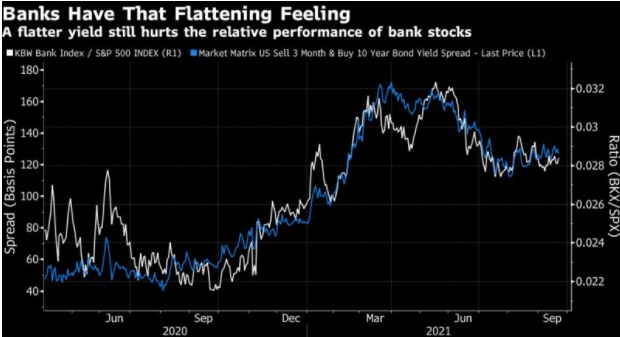 收益率曲线继续对银行业发挥着重大影响。传统上,银行会从更陡的曲线中获益,因为这使贷款业务更有利可图;自去年4月危机平息以来,银行股的相对表现与收益率曲线一致。 这是另一个明显的迹象,表明涉及利于银行的“通货再膨胀交易”已经搁浅。这至少在一定程度上是因为投资者认为美联储过于强硬。