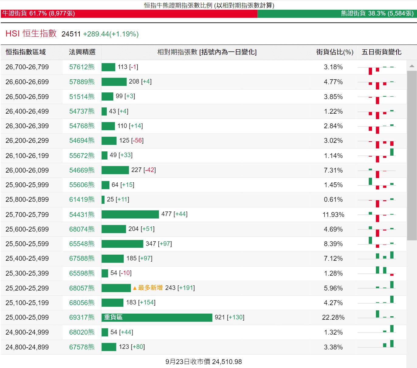 智通财经APP获悉,截至9月24日,恒指最新的牛熊街货比例为62:38。
