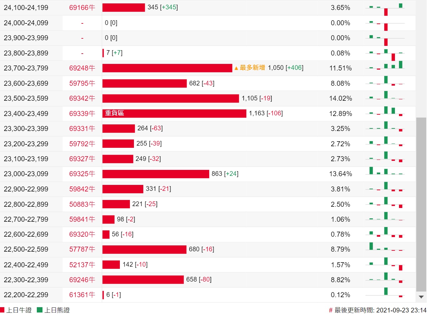 牛证街货重货区在23,400-23,499区间,该区间最新牛证数量为1,163张,较上一交易日减少106张;最多新增在23,700-23,799区间,该区域最新牛证数量为1,050张,较上一交易日增加406张。