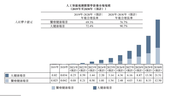 根据弗若斯特沙利文数据,人工智能视网膜医学影像市场规模预计自2020年的7600万元增至2030年的340亿元,2020年至2030年的年复合增长率超80%。其中大健康场景中人工智能视网膜医学影像尚有大量需求未被满足,预期2020年至2030年将以90.7%的年复合增长率,较医疗健康场景更快速地增长。