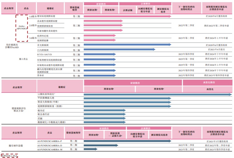 更为关键的是,鹰瞳科技正致力于推进其核心产品以涵盖新适应症,旨在于中国开发最全面的人工智能视网膜影像识别的诊断解决方案。截至最后实际可行日期,公司正在准备Airdoc-AIFUNDUS (2.0)的临床试验,其旨在涵盖高血压性视网膜病变、视网膜静脉阻塞及年龄相关性视网膜黄斑变性。公司计划于2021年10月开始多中心临床试验并于2022年第二季度申请国家药监局的新适应症注册批准,根据弗若斯特沙利文的资料,获批后,Airdoc-AIFUNDUS (2.0)有望成为中国首个可用于多种获批适应症的人工智能辅助诊断SaMD。