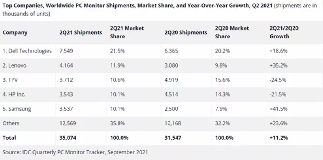 第二季度全球PC显示器商用市场出货量与去年同期相比市场份额略有下降。尽管全球复工率在提升,但是商用市场并没有明显的好转,企业级用户更倾向于购买PC。家庭用户和游戏显示器在2021年第二季度带动了大部分需求,以消费者为中心的小厂商也因此受益。二季度TOP5以外的厂商市场份额从去年同期的32.2%提升至36%。