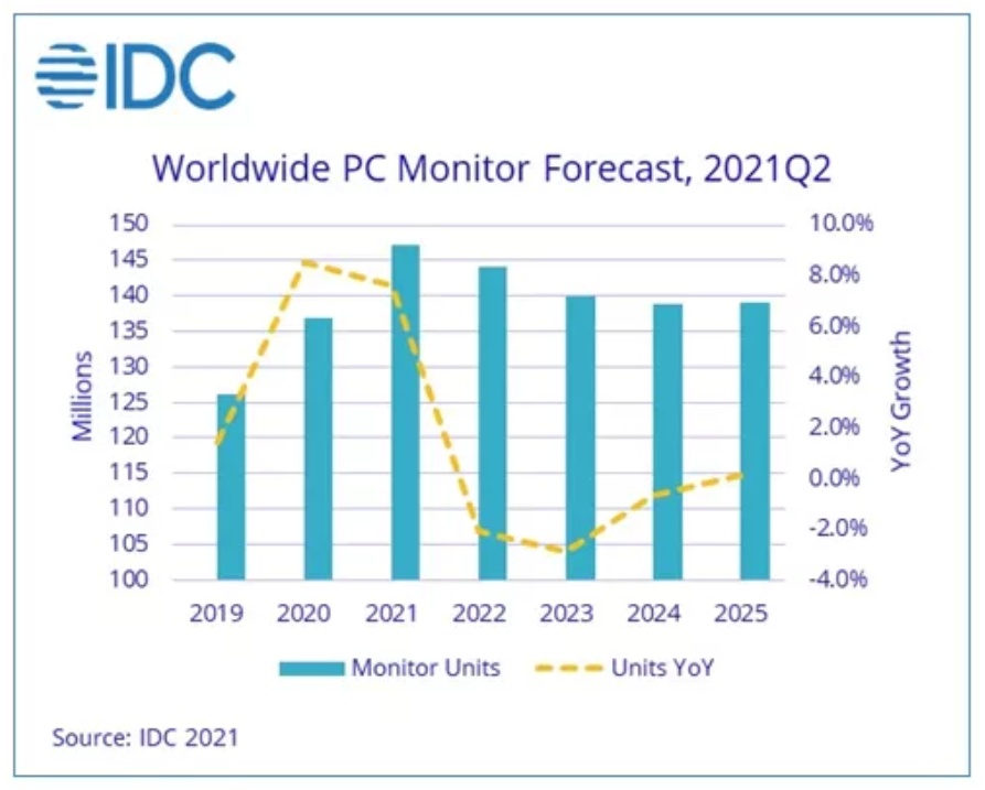 智通财经APP获悉,IDC发布报告称,伴随着强劲的终端需求,缺货的压力在二季度持续影响PC显示器市场。2021年第二季度,全球PC显示器出货量超过3,500万台,同比增长11.2%。一方面,上游电子配件尤其IC缺货严重,导致显示器市场供不应求;另一方面,运输成本的上升和物流方面的挑战也加剧了PC显示器缺货。同时渠道商对缺货的恐慌情绪等多种因素促使二季度PC显示器价格持续上涨;此外,IDC预计,2021年全球显示器的出货量将超过1.47亿台,达到2012年以来的历史新高。预计未来几年销量将逐渐减少,2025年全球显示器市场规模维持在1.39亿台。