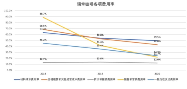 。年报数据显示,2020年瑞幸加咖啡材料成本增长23%至19.95亿元,总收入占比为49.5%;店铺租赁和其他营运成本同比增长8%至17.27亿元,总收入占比为42.8%;折旧和摊销费用同比增长17%至4.83亿元,总收入占比为12%;销售和营销费用为8.77亿元,总收入占比为21.7%;一般行政支出为9.82亿元,总收入占比24.3%。